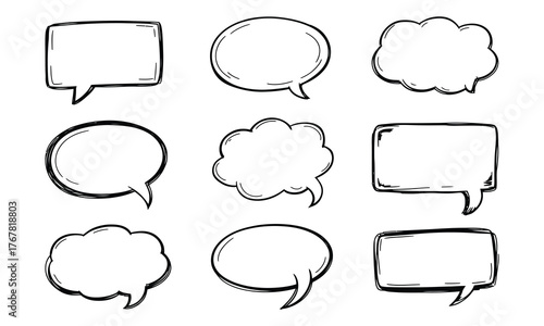 Obraz premium Various black outline shapes form a collection of message bubbles on a white...