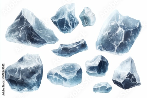 Fototapeta premium Various blue ice chunks isolated.