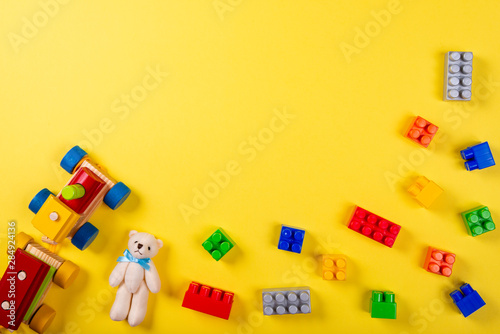 Obraz premium Various children's toys on yellow background. Space for text in the center of...