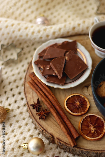 Fototapeta premium Various Christmas decorations, cup of tea or coffee, sweets, small presents, knitted blanket and candles. Selective focus.