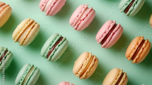 © Creation, Obraz premium Various colorful macarons on mint green background top view pattern