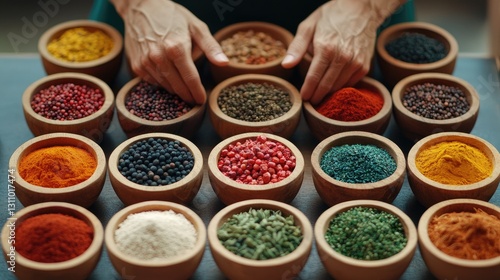 © MarkFinal, Fototapeta premium Various Colorful Spices in Wooden Bowls Arranged on a Table