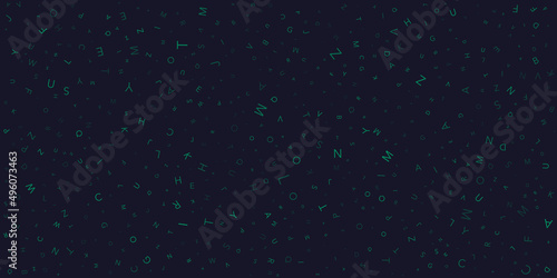 © bagotaj, Fototapeta premium Various Dark Colorful Randomly Placed, Sized and Oriented Green Letters Pattern - Texture, Background, Design Element in Editable Vector Format