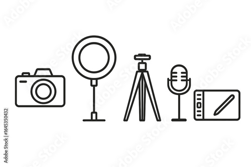 © Антон Сальников, Obraz premium Various equipment for photography and content creation featuring a camera, ring light, tripod, microphone, and graphic tablet