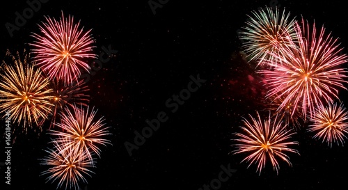 © Steffani, Naklejka premium Various fireworks exploding in the night sky with bursts of red gold and green colors illuminating the dark