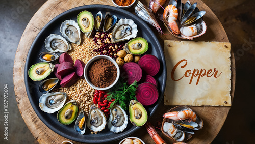 Fototapeta premium Various fresh food, seafood and vegetables with the copper sign