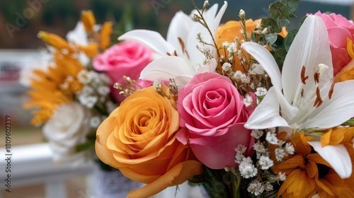 © lililia, Naklejka premium Various fruits and vegetables are creatively arranged around two loaves of bread and an open book, creating a vibrant centerpiece