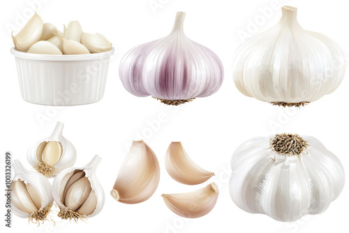 Fototapeta premium Various garlic cloves and bulbs displayed on a white isolated background....