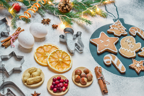 Fototapeta premium Various ingredients for baking cookies on a snow-covered background.