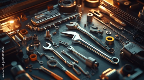Fototapeta premium Various metal tools arranged neatly on a reflective work surface
