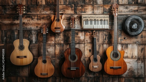 Naklejka premium Various musical instruments adorn a rustic wooden wall beautifully