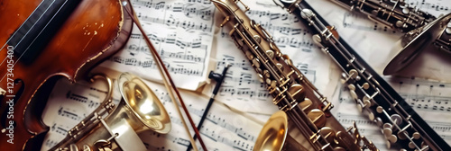 Naklejka premium Various musical instruments lie on sheet music of a symphony