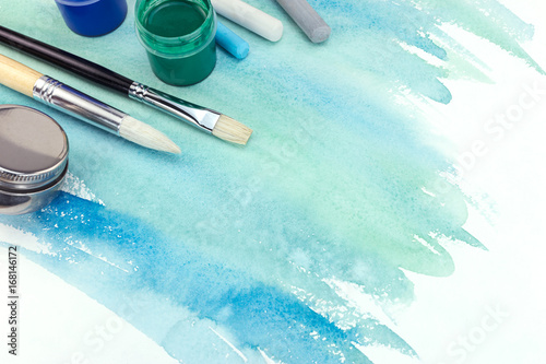 Naklejka premium various paintbrushes, paints and pastel chalks on green blue watercolor...