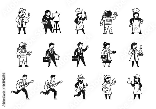 © Gennyson Marinho, Naklejka premium Various professions represented as line drawings including astronaut and doctor figures