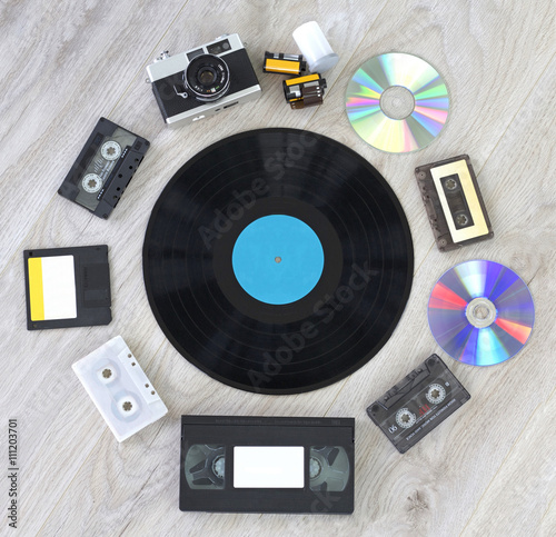 Obraz premium Various retro things. Camera, film, vinyl record disc, audio cassette, video cassette and CD