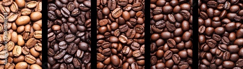 © CreativeLoom, Fototapeta premium Various roasted coffee beans showcasing diverse colors and textures on a dark background.