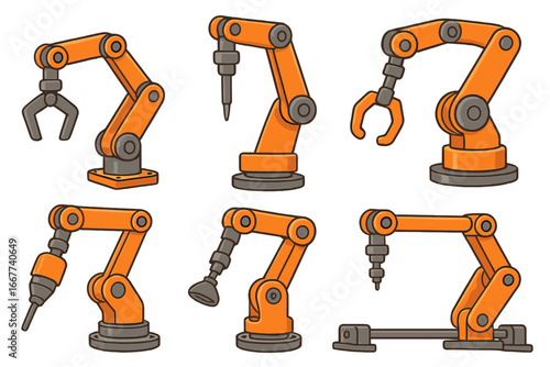 Fototapeta premium Various Robotic Arms and Automation Tools for Precision Engineering Tasks, Industrial Robotics, Mechanical Automation, Vector Cartoon Illustration on Transparent Background