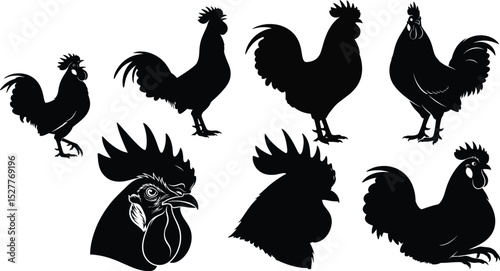 Naklejka premium Various Rooster Poses Silhouette Pack,Diverse Rooster Silhouettes - Crowing, Standing, and Headshot Vector Design,Rooster Silhouette Vector Bundle