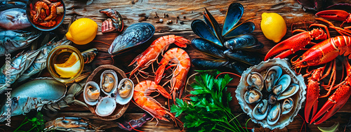 © Яна Ерік Татевосян, Fototapeta premium Various seafood on a wooden background. Selective focus.