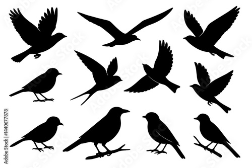Fototapeta premium Various silhouettes of birds in flight and resting positions against a white background