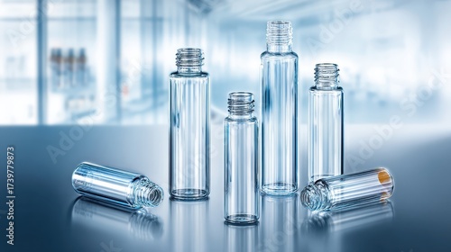 © FarAway, Naklejka premium Various sizes of empty glass bottles on reflective surface