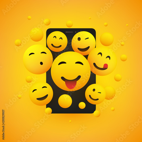© bagotaj, Fototapeta premium Various Smiling Happy Yellow Emoticons in Front of a Smartphone Screen, Vector Concept Illustration