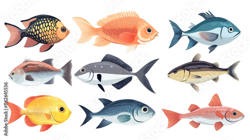 © Sabana, Fototapeta premium Various species of colorful fish swimming together in a vibrant underwater scene.