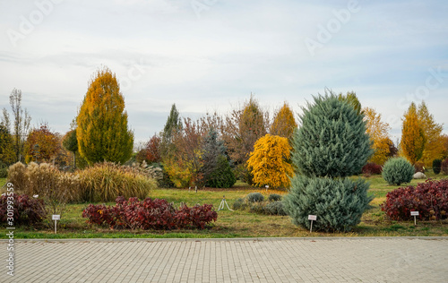 Naklejka premium Various species of trees and decorative shrubs specific to the temperate climate in autumn foliage at the botanical garden near Ploiesti , Romania