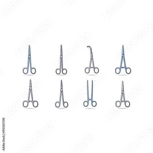 Naklejka premium Various Surgical Forceps and Scissors Isolated on White Background