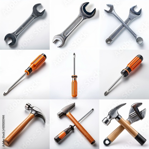 Fototapeta premium Various tools are laid out on a white background, including wrenches, hammers, and screwdrivers.