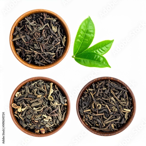 Fototapeta premium Various types of loose leaf tea in bowls with fresh tea leaves for a refreshing brew.