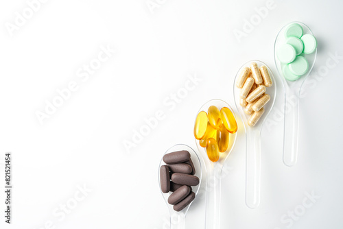 Obraz premium Various vitamin and mineral pills in transparent spoon food supplement health product