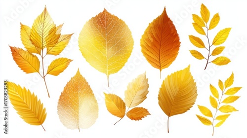 Fototapeta premium Various yellow leaves of different shapes and sizes are displayed,...