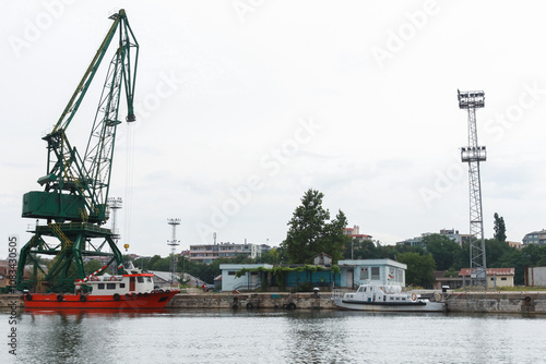 © evannovostro, Fototapeta premium Varna port coastal view, green portal crane is under bright cloudy sky