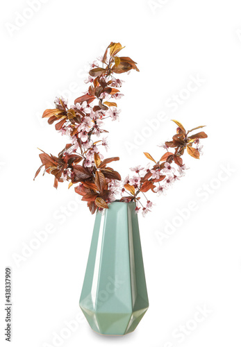 Fototapeta premium Vase with beautiful blossoming branches on white background
