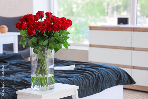 Obraz premium Vase with beautiful red roses on bedside table in stylish bedroom