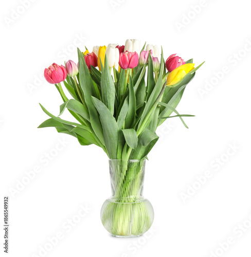 © Pixel-Shot, Obraz premium Vase with beautiful tulip flowers on white background