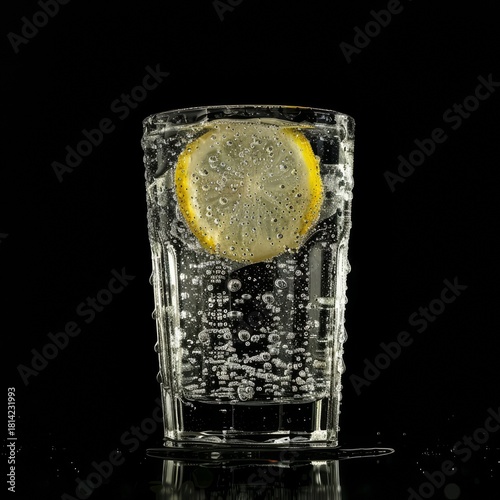 © Loktor, Fototapeta premium Vaso alto de Mojito o Gin Tonic con lima y menta fresca, Bebida refrescante con hielo, rodaja de lima y hierbabuena, Cóctel clásico de verano sobre fondo oscuro con luces bokeh