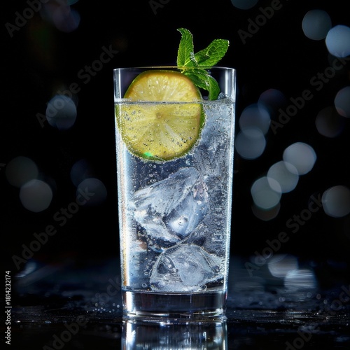 © Loktor, Fototapeta premium Vaso alto de Mojito o Gin Tonic con lima y menta fresca, Bebida refrescante con hielo, rodaja de lima y hierbabuena, Cóctel clásico de verano sobre fondo oscuro con luces bokeh