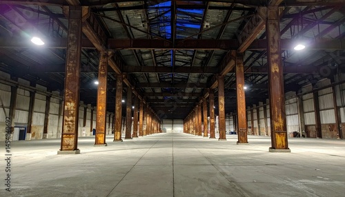 © Kitta Studio, Obraz premium Vast Abandoned Warehouse Interior with Exposed Metal Beams and Lights