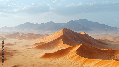 Naklejka premium Vast and serene desert landscape with endless sand dunes and a bright blue sky creating a picturesque natural scene