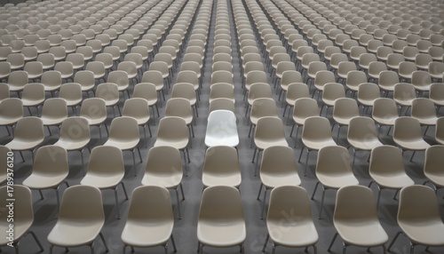 Fototapeta premium Vast Assembly of Empty Plastic Chairs in a Symmetrical Pattern Within a Spacious Indoor Venue