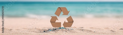 Naklejka premium Vast beach covered in marine debris, with a recycling symbol in the sand,...