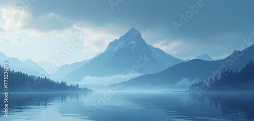 Fototapeta premium Vast blue mountain lake under cloudy sky, reflecting towering peaks. Misty...