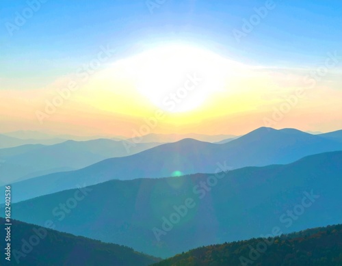 © Yshfrn, Obraz premium Vast blue mountain layers fading into a bright sunrise horizon