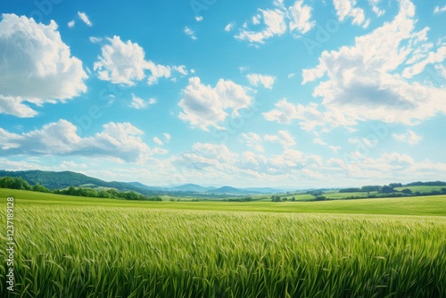 Obraz premium Vast blue sky filled with fluffy clouds over a vibrant green field in a...