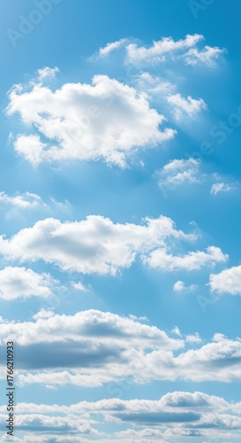 Naklejka premium Vast bright blue summer sky background filled with soft white cumulus clouds gently moving with a light breeze on a perfect sunny day ,daytime ,cloud ,breezy