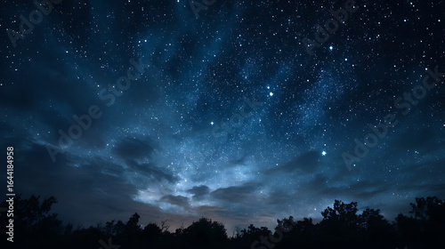 © Masud, Fototapeta premium Vast deep blue night sky filled with countless sparkling stars and wispy clouds above silhouetted trees