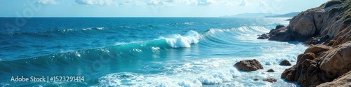 Naklejka premium Vast, deep blue ocean waves crashing against a rocky coastline, creating a dramatic seascape under a bright sky Perfect for travel, nature, and environmental themes , marine, beach, water