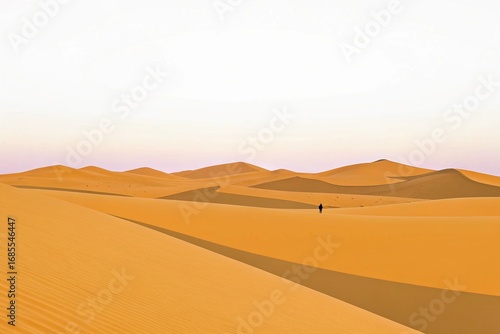 © Belie, Fototapeta premium Vast Desert Dunes Under a Fading Sky with a Lone Figure Walking in the Distance